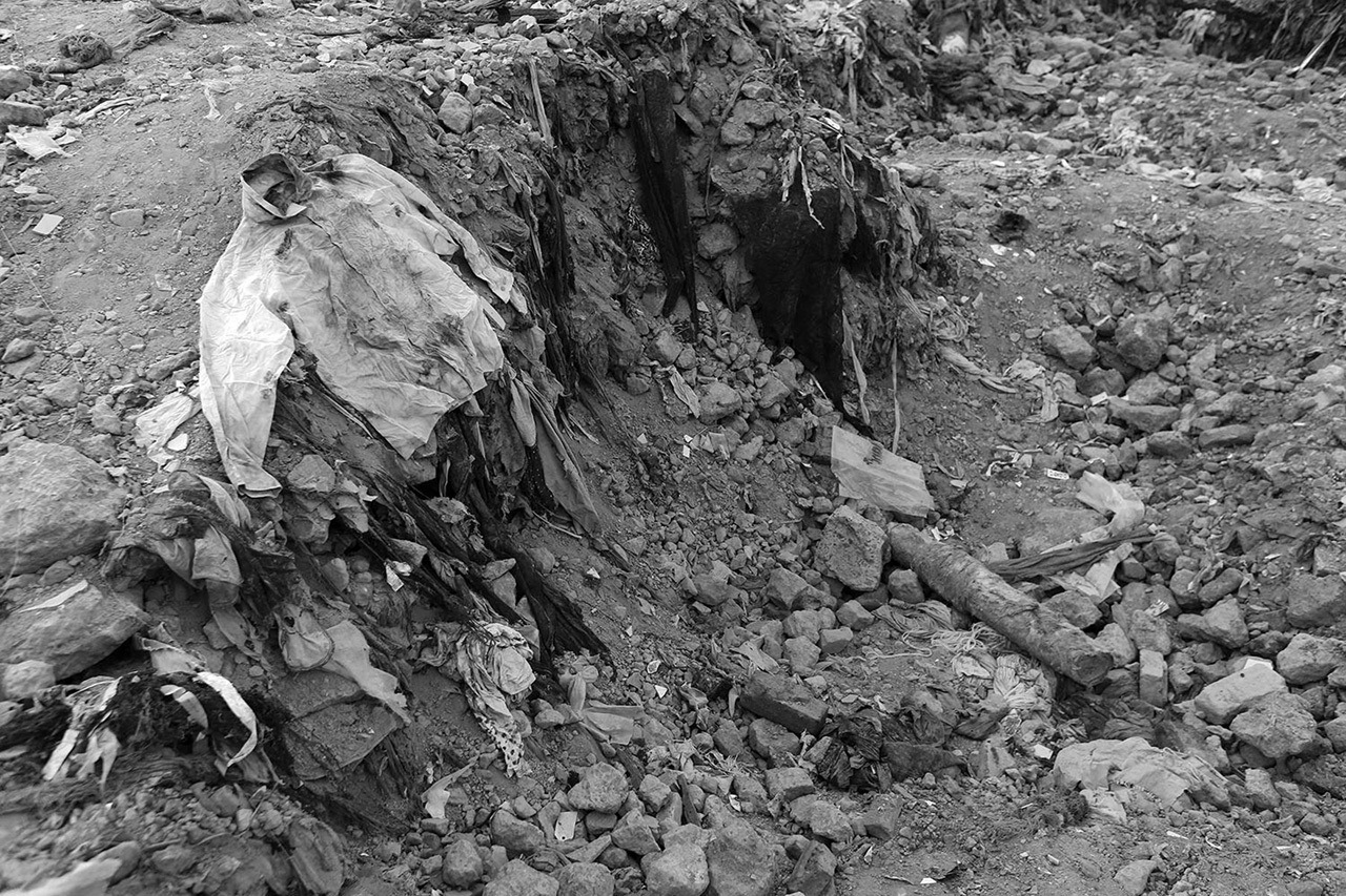 - রানা প্লাজা দুর্ঘটনার অব্যলবহিত পরে ধ্বংসস্তূপের পাশে ওই ভবনের কোনো একটি গার্মেন্টস কারখানার একটি দুমড়ানো শার্ট।